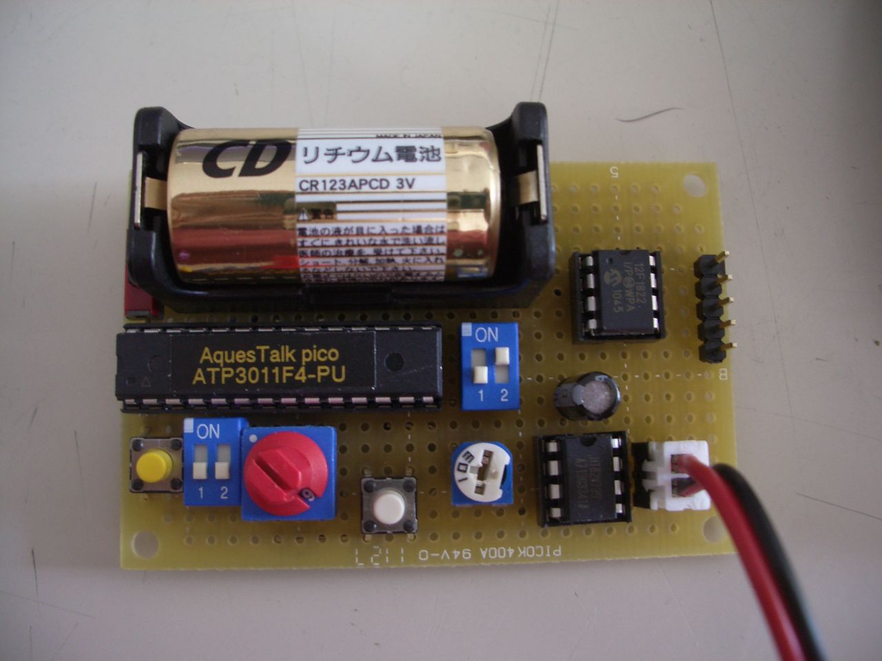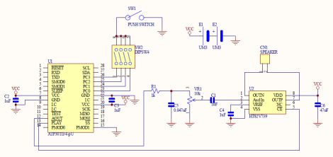 とりあえず、何の芸もないですが、音声合成ICにアンプをつないだだけの回路です。